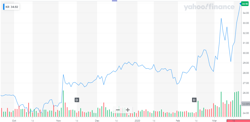 | 5 | KR | Kroger Company | 16.21% | 35.16 | 1.25 | 3.69% | 36.84 | 28.25 | 20,318,242 |