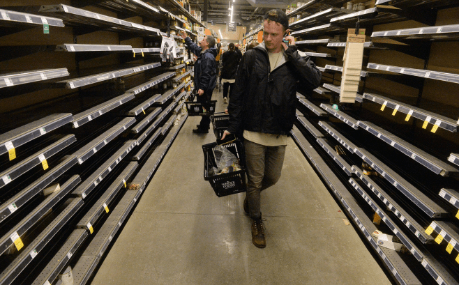 “코로나19 급속 확산 및 그로 인한 경제둔화 공포 확산 속에 미국증시가 장중 대폭락했으나 미국인들의 사재기 열풍 속에 생활용품 및 관련 유통기업 주가는 껑충 올랐다”