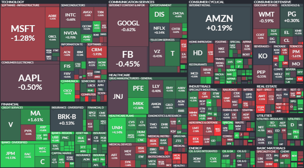 업종 및 산업별 시가총액을 표현하는 맵으로 네모칸이 클수록 시가총액으 크다. (출처 : finviz.com)
