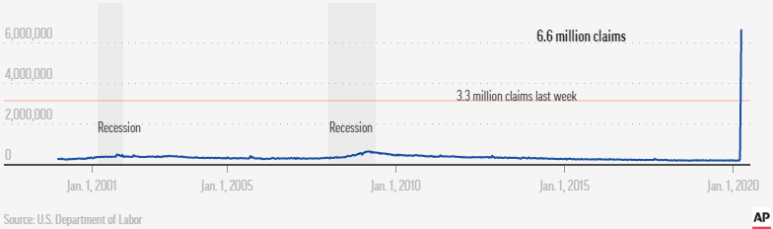 실업 수당을 신청하려고 로스앤젤레스의 Hospitality Training Academy에서 줄을 서서 있는 모습 (출처 : AP News)미국 내 실업 수당 신청자 추이 (출처 AP New)COVID19 미국 내 확진자수 (출처:존스홉킨스)COVID-19 히스토리 ( 출처 : ifs POST 기사)