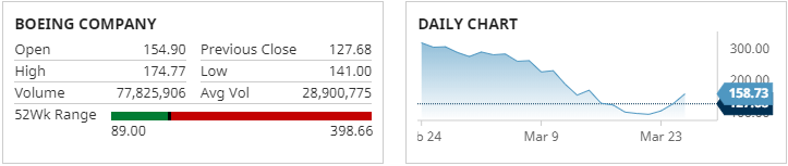 | BA | Boeing Company | 158.73 | 31.05 | 24.32% | 77,825,906 | 12,353,306 | 03/25/20 |