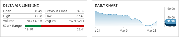 | DAL | Delta Air Lines Inc | 31.1 | 4.21 | 15.66% | 70,733,906 | 2,199,824 | 03/25/20 |