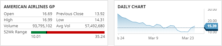 | AAL | American Airlines Gp | 15.39 | 1.47 | 10.56% | 93,795,102 | 1,443,507 | 03/25/20 |