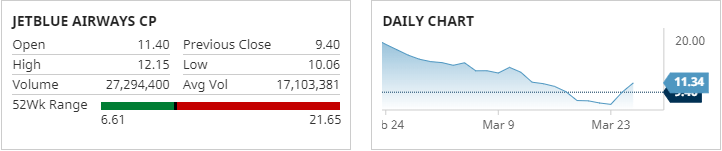 Jetblue Airway(JBLU)전일대비 +20%, 11.34 마감.