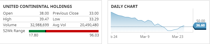 | UAL | United Continental Holdings | 36.6 | 3.6 | 10.91% | 32,988,699 | 1,207,386 | 03/25/20 |