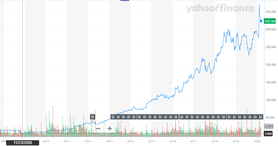 먼저 도미노피자의 주가 흐름은 살펴보면, 2008월 3달러하던 2020년 3월 20일자 기준 320달러로 무려 100배이상 성장하였습니다. FAANG보다 더 빠른 성장을 보여준 업체가 피자회사라는 사실에 더욱 놀랍습니다. 피자회사이 이토록 성장할 수 있었던 이유가 궁금해졌습니다.