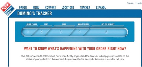 30분 배달보증 대신할 피자추적기(Pizza Tracker)라는 서비스가 등장하게 됩니다. 피자 추적기는 매장 직원이 진행 단계마다 온라인에 ‘주문접수→준비→굽기→완성→배달시작’ 기록 버튼을 눌러 온라인 주문 사이트나 스마트폰 앱에 표시를 해주는 것입니다. 도미노피자는 피자추적기를 주요 기술 여겨 특허까지 출원하였습니다. 초기에는 콜라 주문시에도 굽기 상태가 표시 되는 등의 오류로 비난이 있었으나, 물건이 배달되기까지 진행 상황을 알 수 있다면, 시간이 더 걸리더라도 무작정 기다리는 것보다 낫다는 긍정적인 호응을 얻습니다.